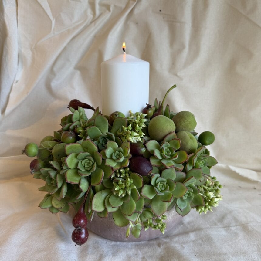 A versatile arrangement that can be used throughout the festive season. Gorgeous long burning tall pillar candle, surrounded by succulents and baby fruits – apples, pears, nectarines & apricots. After enjoying this over the weeks, place on your table for Christmas Day. Designed into a reusable & waterproof distressed pottery vessel.