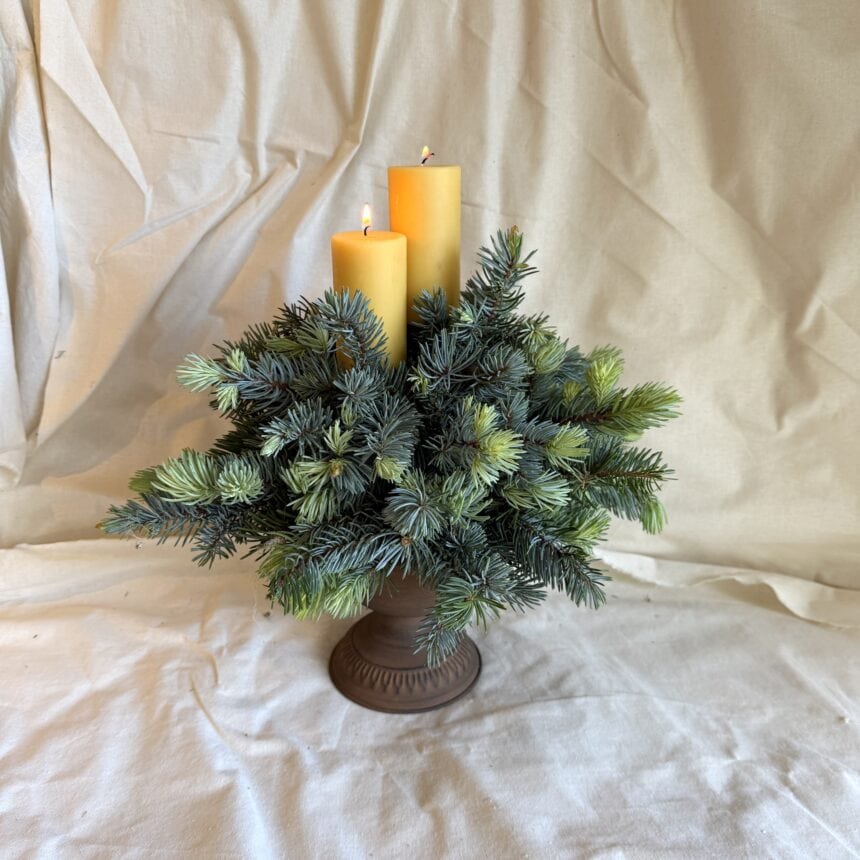 Strong and hardy beautiful green/grey/blue spruce, matched perfectly with 2 x 100% beeswax candles, set into a distressed urn. Again, you can use in the weeks before Christmas and have it pride of place on the big day!