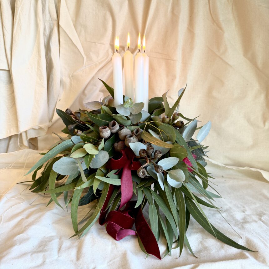 An assortment of various Tasmanian gum foliage & gumnuts. Designed into a glorious distressed round pot that can be repurposed after the festive season.
