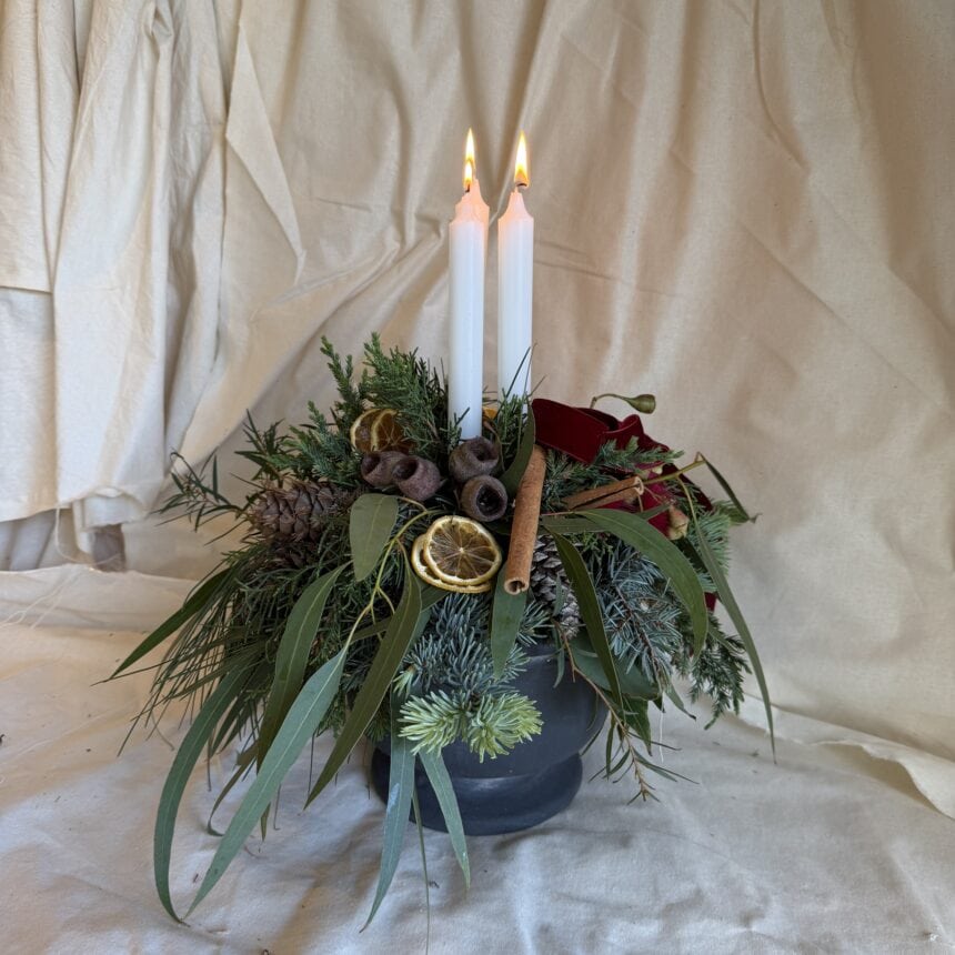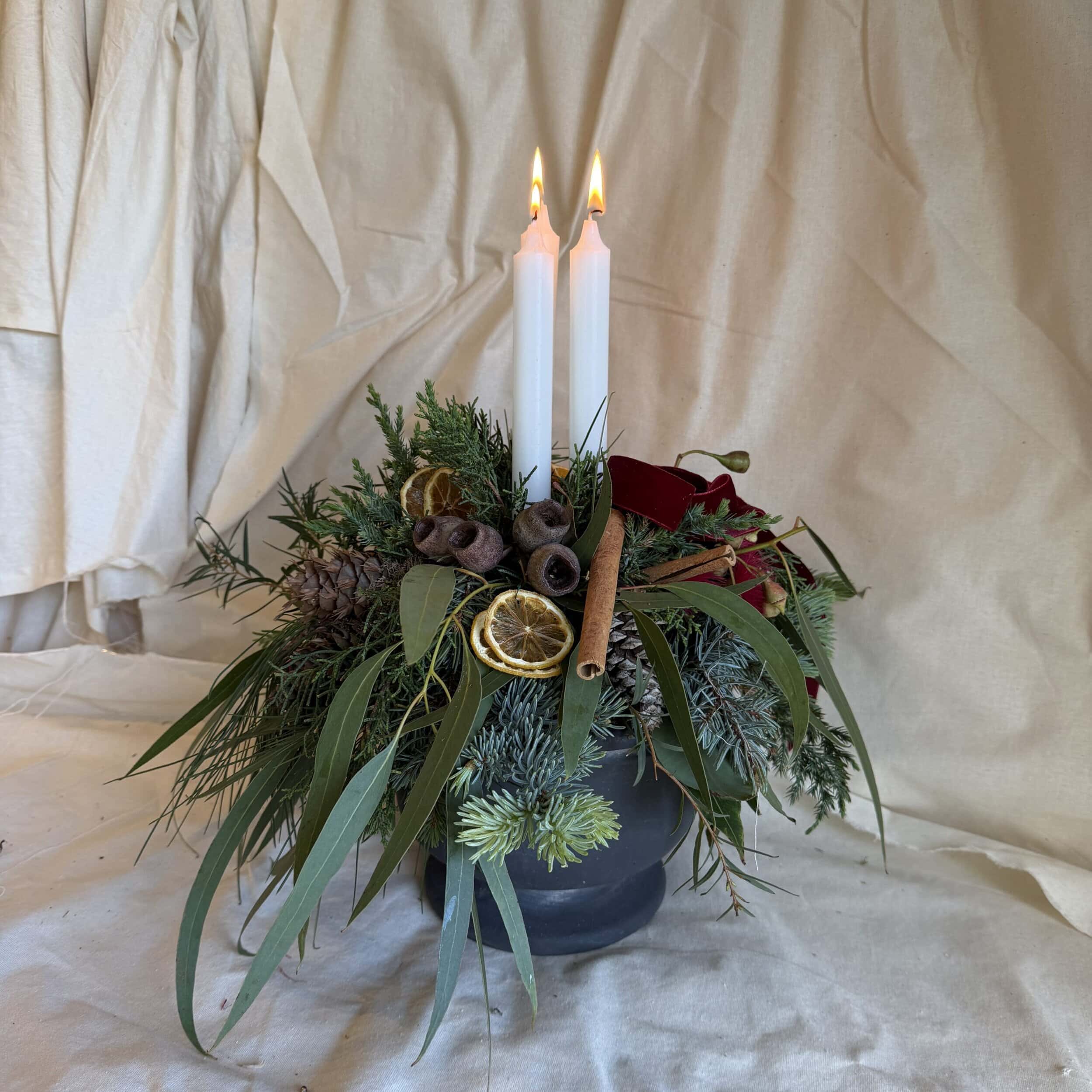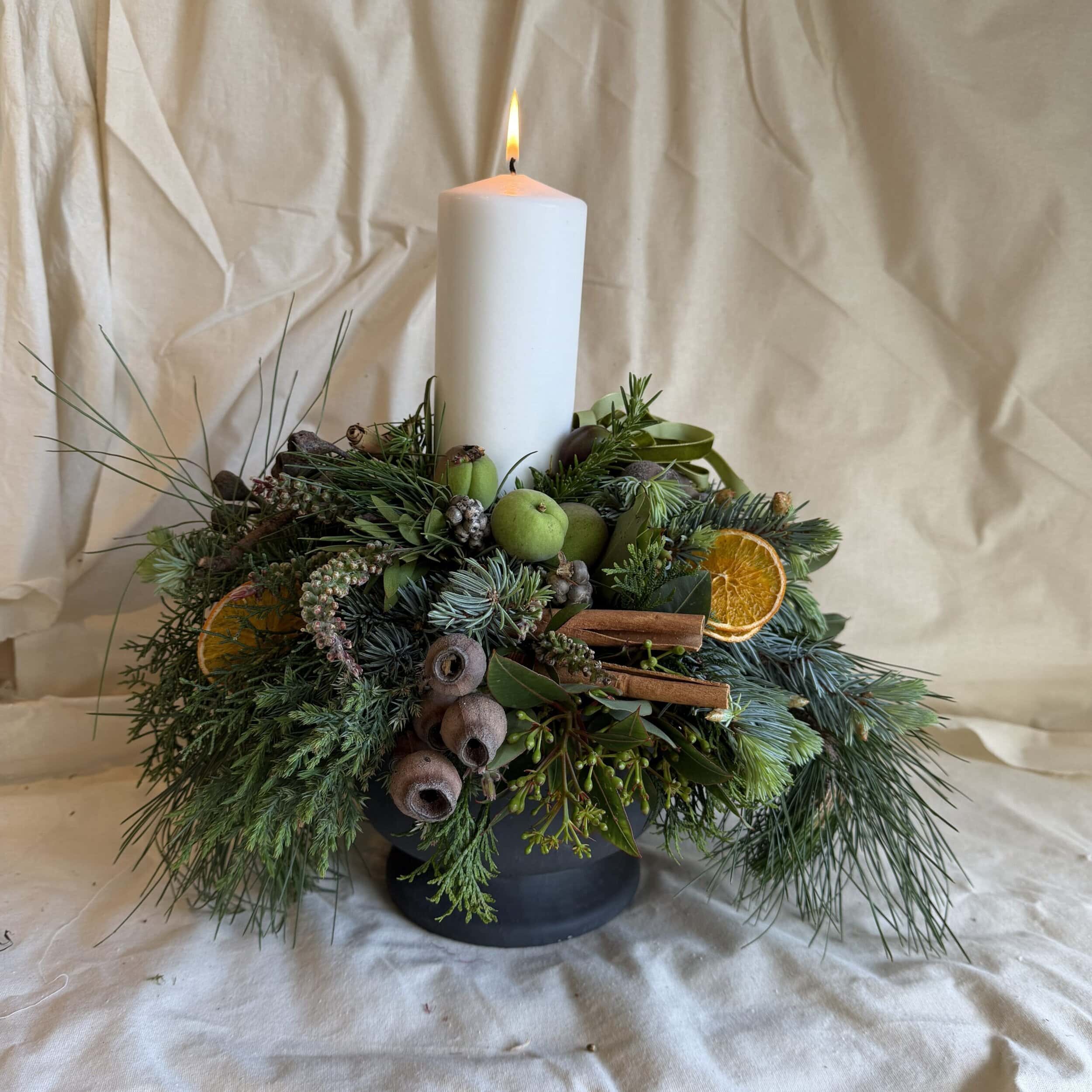 Best of the best of Christmas, all good stuff designed in a beautiful matte black pottery urn that can be reused for multiple things. Think mixed Christmas foliage, cinnamon quills, dehydrated oranges and lemons, baby fruits, gum nuts and a tall long-burning pillar candle.