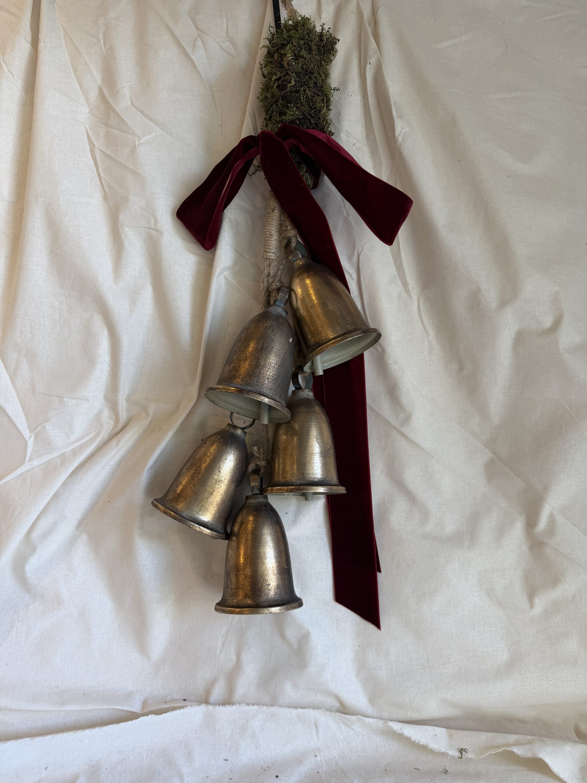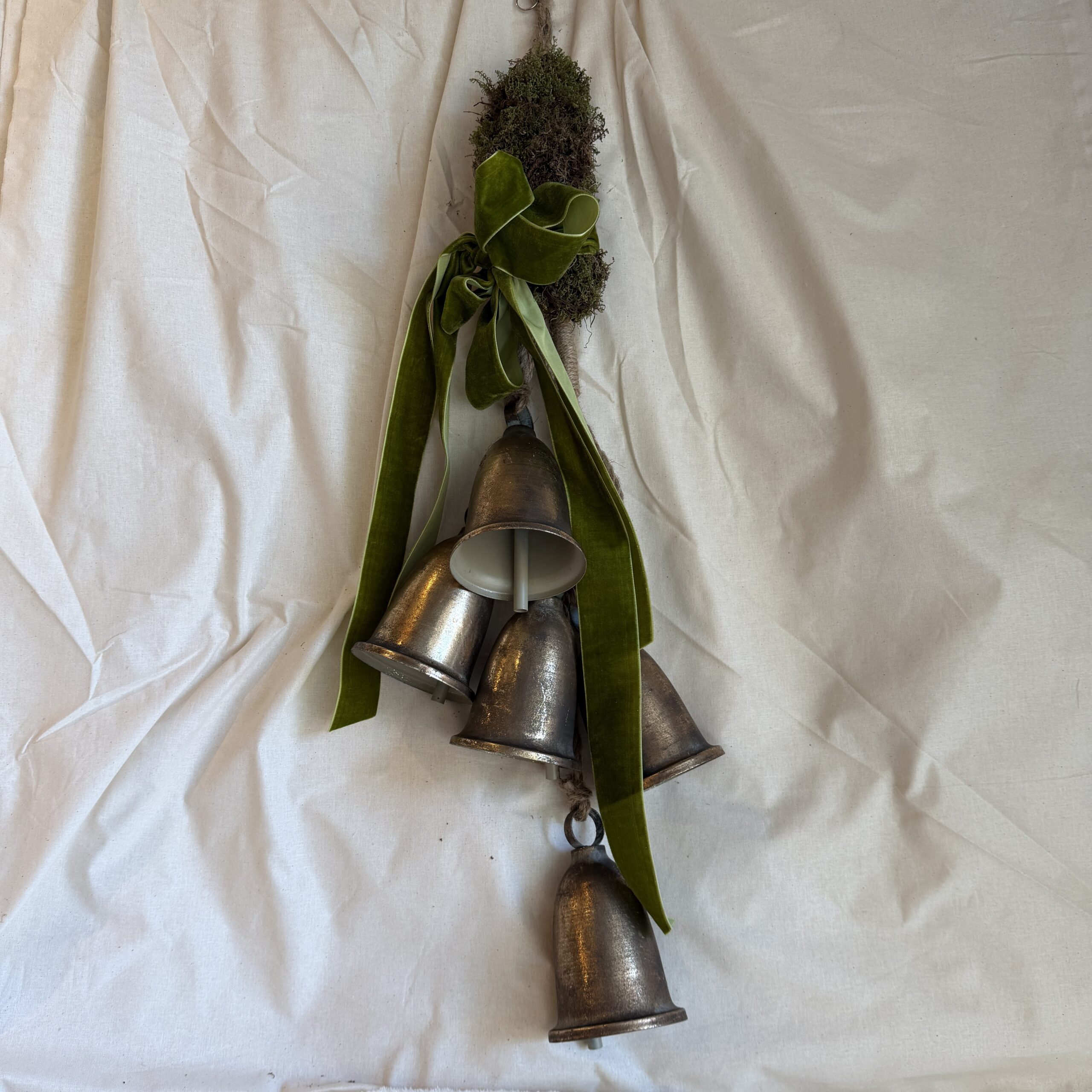 A wonderful addition to your home, 5 x brass bells held together with living green moss and your choice of red or green velvet ribbon. Fabulous for the front door for that traditional jingle that only bells can make.