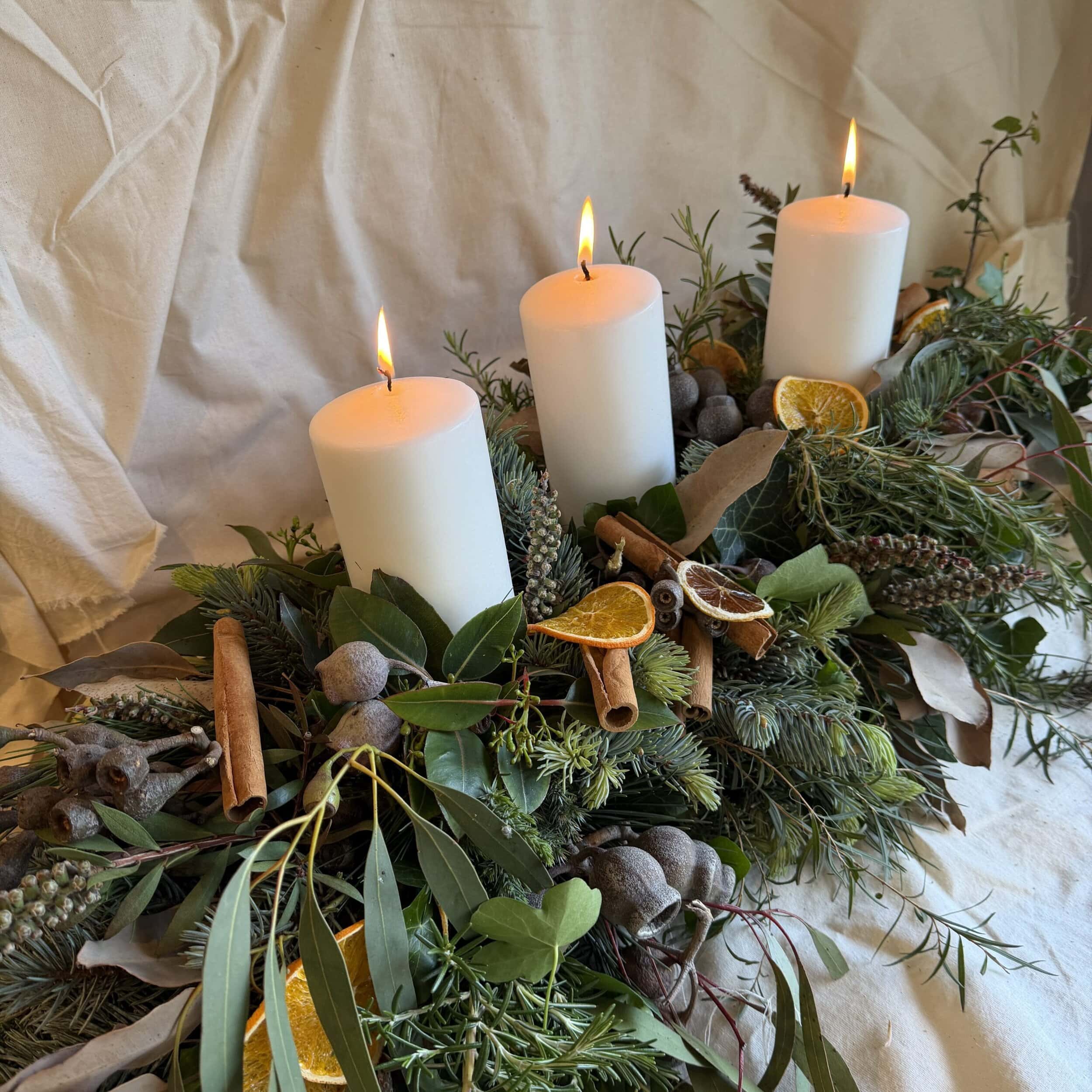 These arrangements are really something!! Overflowering with lush foliage, cinnamon quills, oranges & lemons, baby fruits, gum nuts and so much more. 3 x tall wide pillar candles (2 in the small) they are a perfect decoration for your table or mantle.