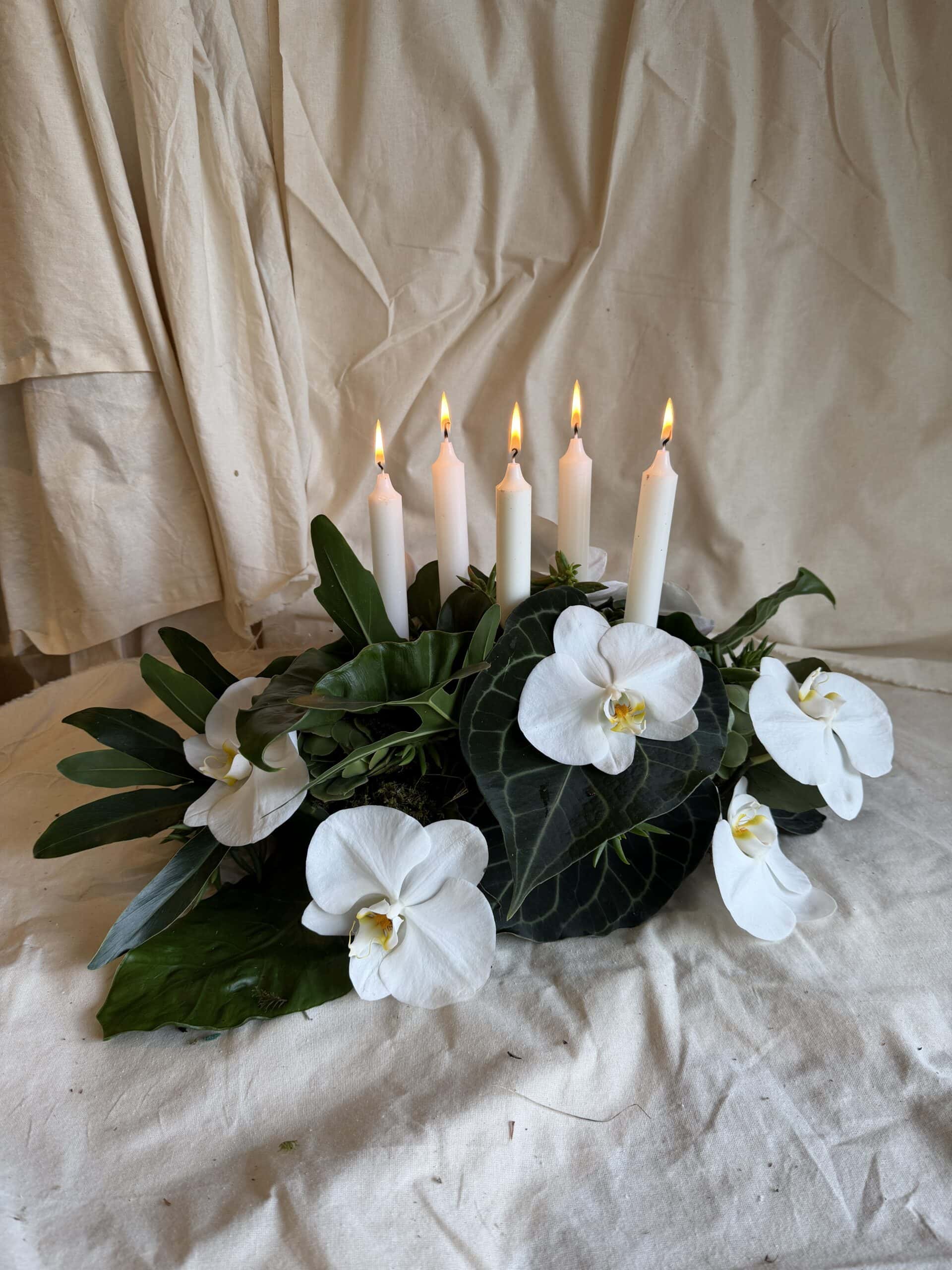Using tropical leaves, including amazing turtle leaves, this arrangement is set to spark up your festive season. 8 x pure white phalaenopsis orchid blooms together with succulents and green living moss & 5 x white pillar candles set the scene.